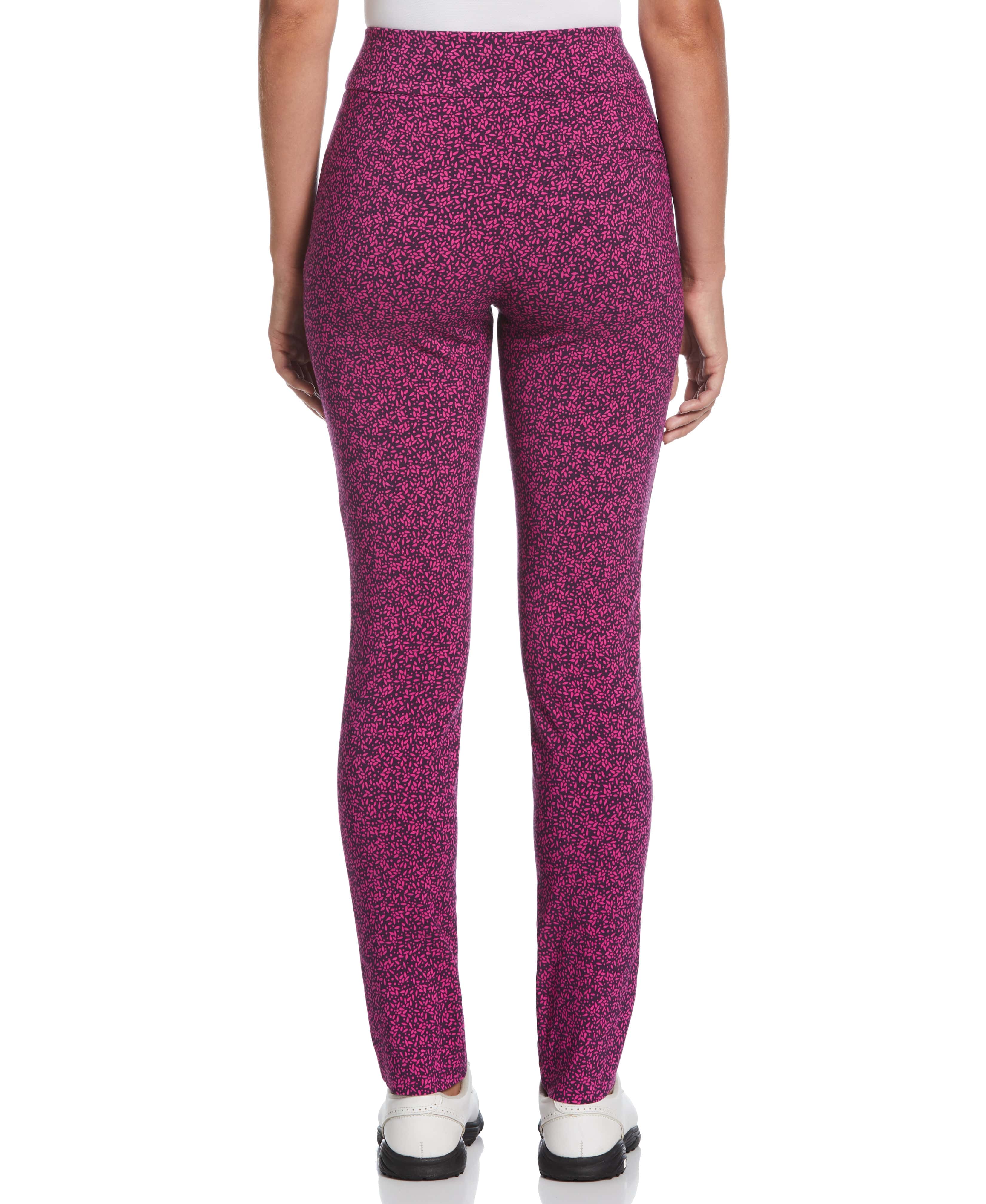 Featuring a lively geometric print, these PGA TOUR Apparel women’s golf pants will add some energy to your athletic wardrobe. The ladies’ golf pants feature performance stretch to let you move freely throughout each round, and they have built-in Tummy Control shapewear to help provide a sleek silhouette. Sun protection blocks harmful UV rays from passing through the material, while moisture wicking manages sweat to help keep you dry. The plain weave fabric provides impressive durability, making these pull-on golf pants equally great for everyday casual wear.